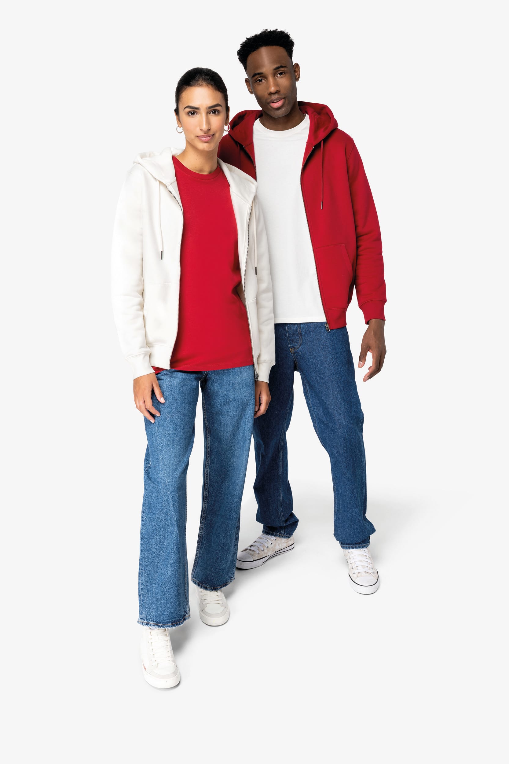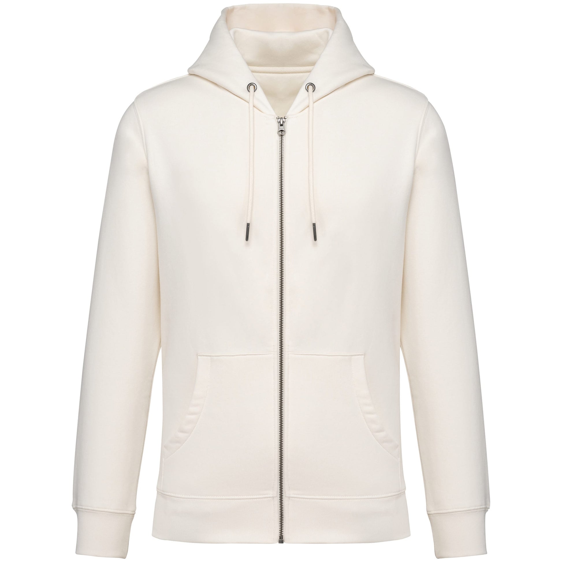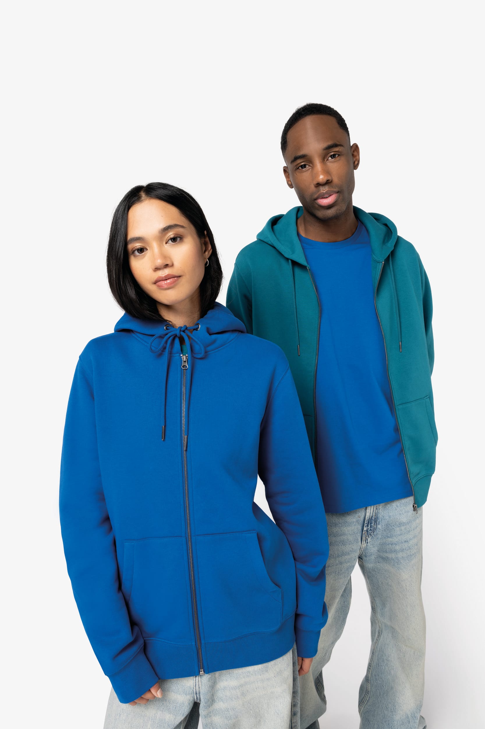 85% coton biologique / 15% polyester recyclé post-consumer. Coton peigné ringspun. Coupe ajustée. Lavé aux enzymes. Molleton gratté 3 fils LSF (Low Shrinkage Fleece : molleton pré-rétréci). 1/2 lune au dos. Poche kangourou. Bord cote 1 x 1 bas de vêtement et bas de manches. Double surpiqûre bas de manches, emmanchures, bas de vêtement et 1/2 lune. Bande de propreté intérieur encolure dos. Capuche doublée en matière principale avec point d’arrêt cordon. Cordon rond avec embouts et oeillets en métal recyclé. La couleur Raw Natural se distingue par son aspect brut visuellement texturé, parsemée de fines particules visibles à l’œil nu.