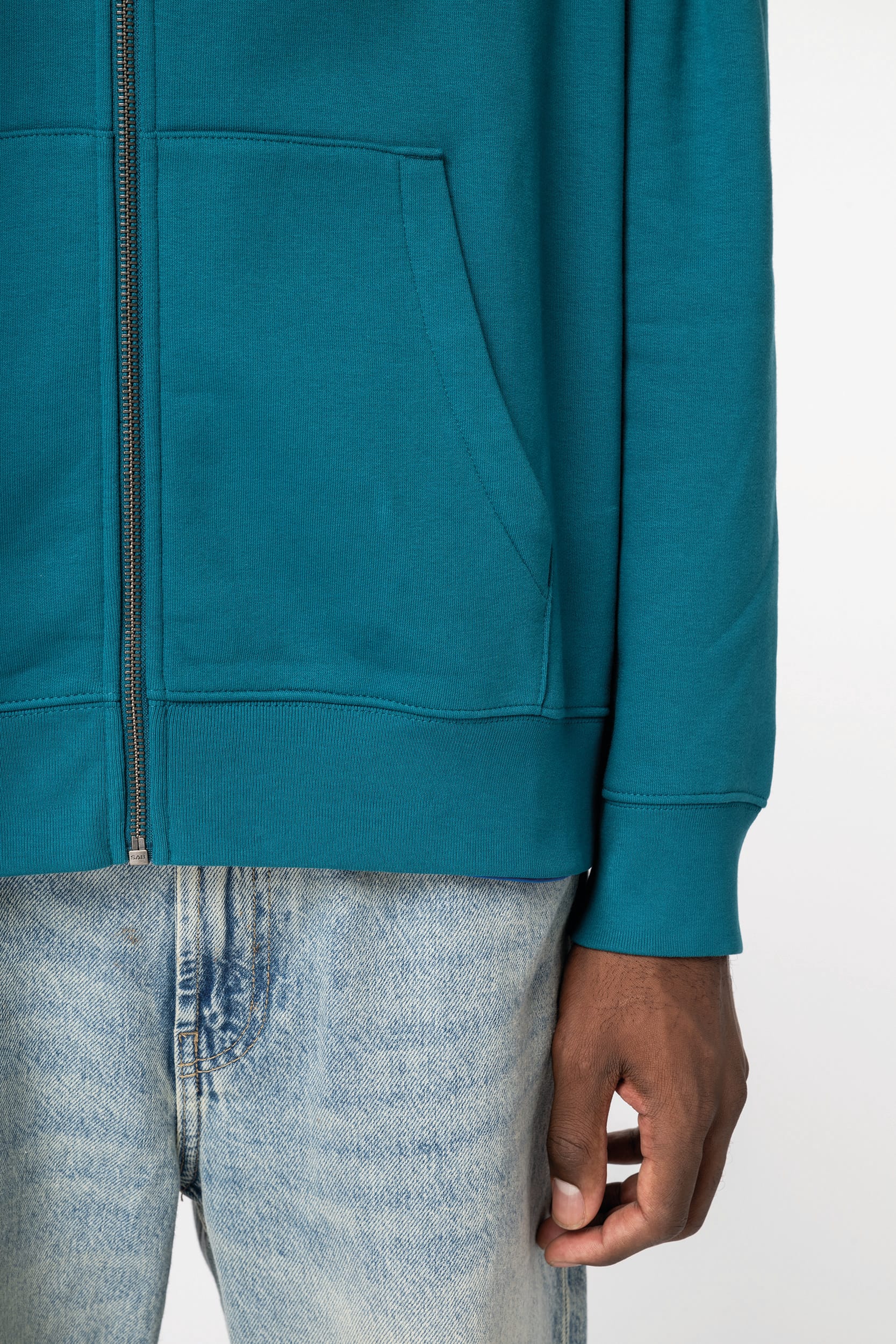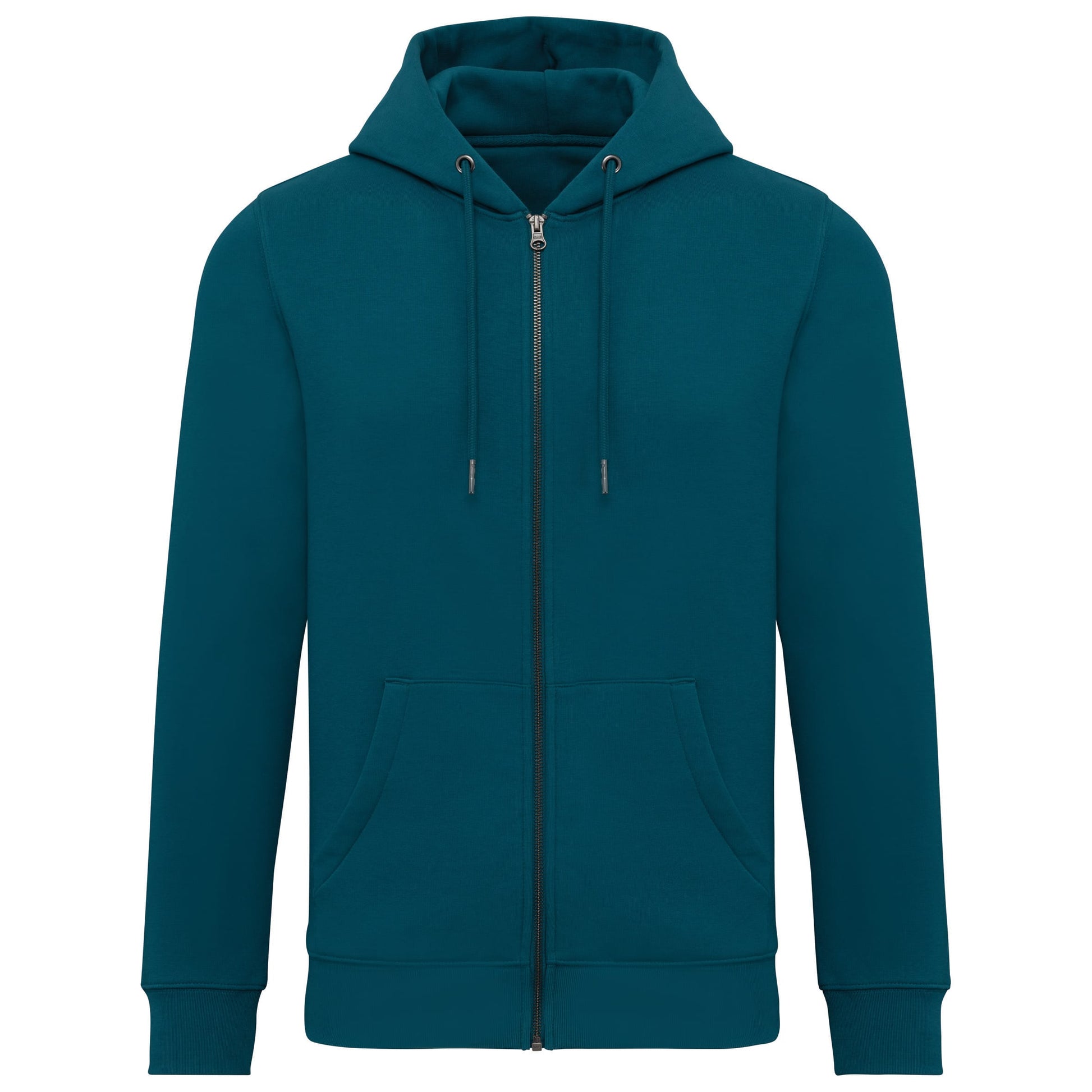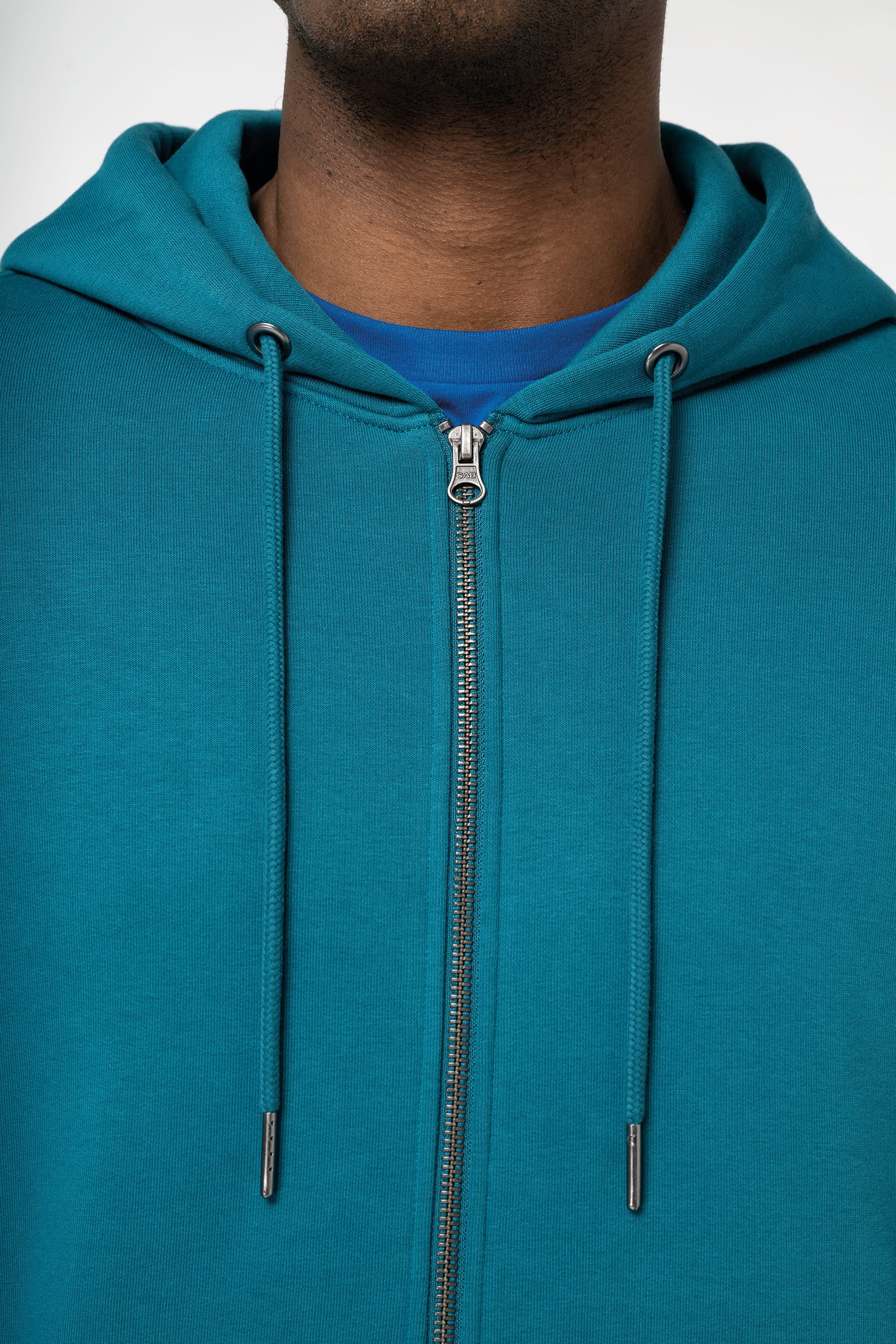 85% coton biologique / 15% polyester recyclé post-consumer. Coton peigné ringspun. Coupe ajustée. Lavé aux enzymes. Molleton gratté 3 fils LSF (Low Shrinkage Fleece : molleton pré-rétréci). 1/2 lune au dos. Poche kangourou. Bord cote 1 x 1 bas de vêtement et bas de manches. Double surpiqûre bas de manches, emmanchures, bas de vêtement et 1/2 lune. Bande de propreté intérieur encolure dos. Capuche doublée en matière principale avec point d’arrêt cordon. Cordon rond avec embouts et oeillets en métal recyclé. La couleur Raw Natural se distingue par son aspect brut visuellement texturé, parsemée de fines particules visibles à l’œil nu.