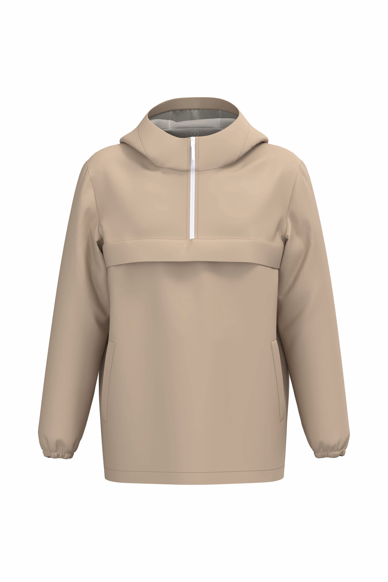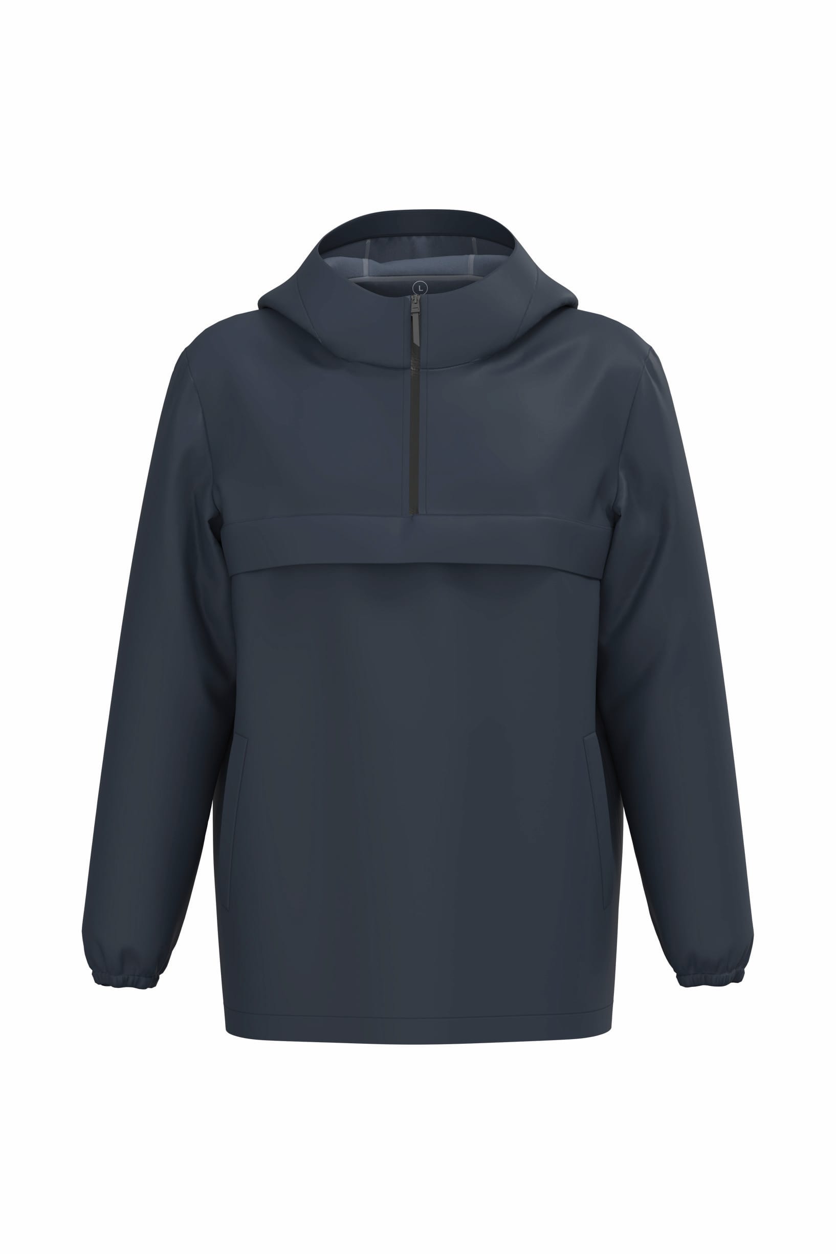 100% polyester recyclé post-consumer. Coupe droite. Tissu contrecollé 2 couches avec membrane intérieure et coutures thermo-soudées permettant au produit d’être imperméable. Imperméable 4000mm. Respirant 3000 g/m²/24h. Milieu devant avec quart de zip imperméable recyclé. Poche poitrine traversante avec rabat et deux poches côtés passepoilées avec zip inversé. Deux œillets d’aération sous le rabat de la poche devant. Capuche 3 panneaux. Cordon de serrage avec stoppeurs recyclés à l’intérieur de la capuche et au bas du vêtement côté gauche au porté. Bas de manches élastiqués. Ourlet simple surpiqûre bas de manches et bas de vêtement.